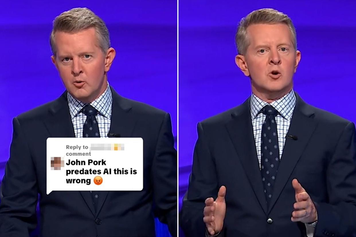 The clue read, “No: A.I. Generated The TikTok Image of this pig/human eventually killed by Tim cheese.” After reading it, Jennings remarked on-air, “I didn’t understand any of that. Who is John Pork?”